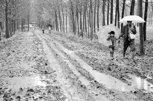9月19日,在商水县袁老乡盛庄通往郭楼的“泥水路”上,小学生踩泥涉水去上学。连日来,不断有村民拨打本报新闻热线称,该路段的修路款已经下拨,可迟迟不见开工。袁老乡盛庄村党支部书记接受采访时称,目前这段路已经完成了招投标,近日将开工建设。本报记者 摄