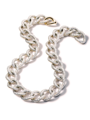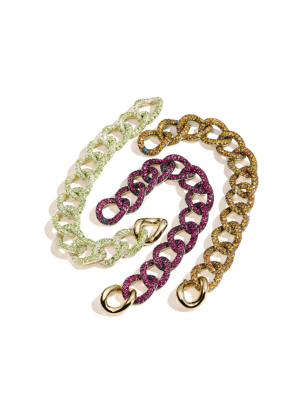 要更奢华一些,则可以在锁链之上,镶上白钻,或是搭配自己肤色的水晶或彩宝,奢华感立现,却又与传统花形珠宝显然区隔开。