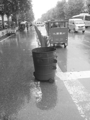 本报讯 近日,有市民拨打本报新闻热线反映,在周口市区七一路、五一路和人民路三条主次干道上新增的100个挂桶式垃圾桶(如图)正在逐渐减少。川汇区爱卫会表示,他们将加大对这些新增垃圾桶的管理力度。