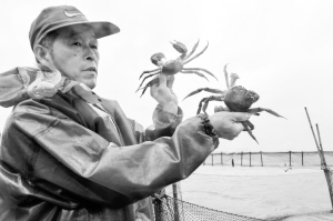 9月23日,一名蟹农在展示刚捕捞的大闸蟹。