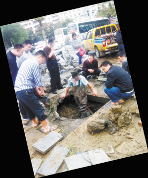 当日8时许,记者在现场看到,“银龙”工作人员打开井盖,并凿开周围路面,抽取井里面的积水。“早上一接到市民的电话,我们就赶来了。现在只能先抽干净井里面的积水,我们才能查找出跑水的原因。”工作人员一边忙碌着一边说。