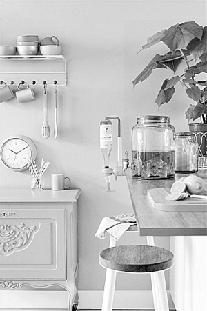 刚刚结婚的小女人,哪儿都是甜蜜的,厨房自然也少不了这样的心情。五颜六色的装饰,让整个厨房都沉浸在幸福中,糖果色的厨房,让下厨都成为一件甜蜜的事——绿色的柜子、白色的凳子,还有五颜六色的碗碟杯,甚至是自制的饮料都是让人暖暖的颜色。这样的厨房,其实做什么并不重要,只要看看可爱又幸福的颜色,甜蜜自在心中。