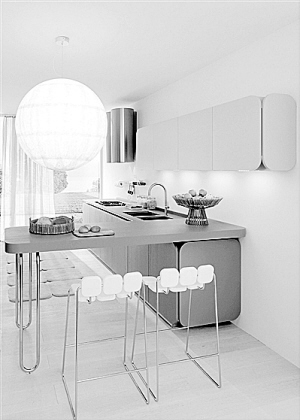 许多女性在性格上淡定、成熟,她们往往自信、智慧,因此,她们的厨房也传递出安静的气质。金属色的橱柜传递出成熟的味道,井井有条的设计,让厨房工作不再手忙脚乱。厨房用纸、厨具、厨房调料等物品一字排开,水果也成为厨房里亮眼的装饰。吧台的设计可能最适合这些成熟的女性,与众不同的设计符合她们的要求。具有设计感的吧椅,更是整个空间的亮点,厨房和餐厅的结合通过橱柜实现,一个圆形大吊灯则让成熟女性独立的气质表露无遗。