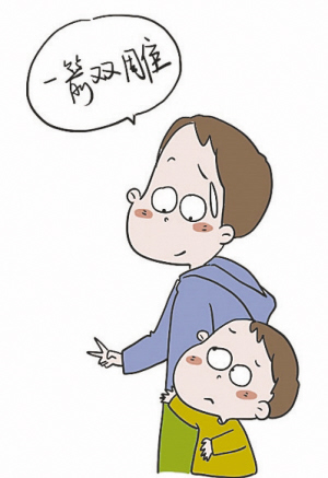 看他得意洋洋的样子,我又教了他一个新词:一箭双雕。他学了半天,一会儿“一箭双超”,一会儿“一箭双飘”。我给他解释,这个词的意思是一箭射出去射中俩雕,雕和鹰差不多,就是一种鸟。听我解释完,他竟然很生气地对我说:“谁这么狠心,一个不行还射俩,这么没有爱心。”