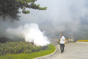 工作人员在广州一公园内喷洒灭蚊药物