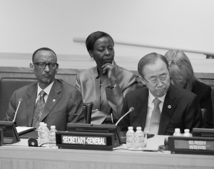 当地时间9月26日,卢旺达总统卡加梅(前左)、联合国秘书长潘基文(前右)在纽约联合国总部出席联合国维和行动问题高级别会议。当日,联合国就维和行动问题举行高级别会议。联合国秘书长潘基文宣布将任命一个高级小组,对联合国维和行动及政治特派团进行评审。 新华社记者 殷博古 摄