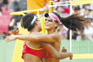 9月28日,中国选手马园园(右)与夏欣怡在比赛中庆祝得分。当日,在2014仁川亚运会女子沙滩排球决赛中,中国选手马园园/夏欣怡以2∶0战胜泰国选手拉达隆/尤多查维,夺得冠军。新华社记者 沈伯韩 摄