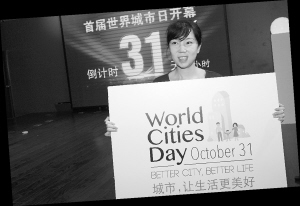 9月29日,在上海,工作人员在首届“世界城市日”倒计时牌前展示本届城市日标志。