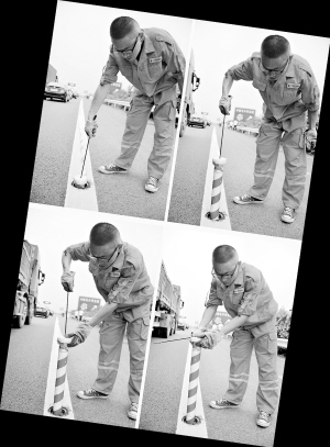 9月29日,江苏宁沪高速公路常州管理处的工作人员拉起“暗埋式隔离桩”(拼版照片)。