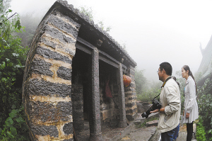 至此,我们已无法登顶。小田告诉我们,紫金顶是神农山的主峰,海拔1028米,傲立群山之巅,巍峨挺拔,直插云霄,号称“中天玉柱”。紫金顶部为1000平方米的平台,四周为悬崖峭壁,悬崖上生长着古老的白松,实为登峰造极之所在。峰顶常年紫气环绕,金光流溢,与南顶武当并誉海内外。紫金顶上还有一个长、宽、深约1米的石坑,相传是伏羲氏卧听风声、悟画八卦之处,名叫“八卦坑”。