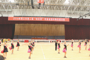 10月2日上午,来自我省20多个县市的千余名舞蹈爱好者齐聚周口市体育馆,在这里进行为期一天的团体舞和个体舞的比赛。图为首先出场的20多名少儿在现场表演团体舞《小苹果》,优美和协调一致的舞姿引来现场观众的阵阵掌声。晚报记者 王凯 摄