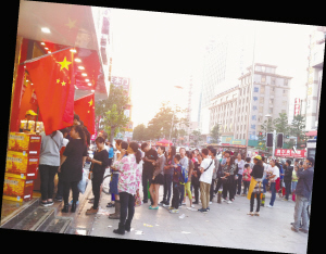 周口市区七一路一商家挂出国旗营造喜庆气氛,同时他们推出多种让利措施吸引大批顾客排队光顾。