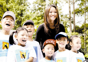10月9日,2014年澳网女单冠军李娜与小球童合影。当日,前不久正式宣布退役的李娜亮相上海,参与2015澳网公开赛的宣传活动。作为2014年澳网女单冠军,李娜表示,明年1月她将作为观众前往墨尔本观看比赛。新华社记者 刘颖 摄