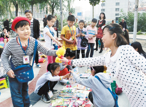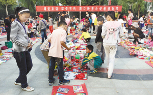 本报讯 为引导小朋友养成节约资源、爱护环境的好习惯,10月7日上午,周口晚报小记者“快乐换物”活动在市区大庆路桥南小广场举行。第一次参与换物活动的小记者显得有些不知所措,在家长和老师的鼓励下,小记者们离开自己的摊位,去寻找自己想要交换的东西,换物节也就热热闹闹开始了。