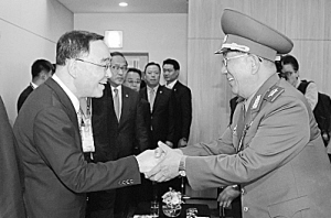 在韩国仁川,韩国国务总理郑烘原(左)与朝鲜人民军次帅、朝鲜国防委员会副委员长、朝鲜人民军总政治局长黄炳誓会面时握手。