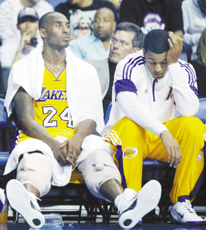 当地时间10月12日,湖人队当家球星科比(左)和队友布朗在场边观战。当日,在美国安大略进行的NBA季前赛中,洛杉矶湖人队以75∶116不敌金州勇士队。新华社发