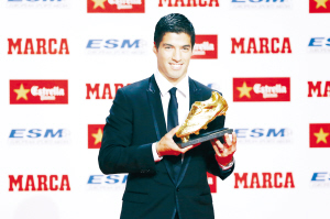 当地时间10月15日,苏亚雷斯展示“金靴”。当日,现效力于巴塞罗那俱乐部的苏亚雷斯领取2013-2014赛季欧洲金靴奖。苏亚雷斯上赛季代表英超利物浦俱乐部在联赛中打入31粒进球,与皇马俱乐部的克·罗纳尔多在西甲联赛的进球持平,因此两人共同获得了2013-2014赛季欧洲金靴奖。新华社发