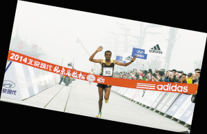 据新华社北京10月19日电 19日进行的2014年北京国际马拉松赛遭遇了“霾”伏,中国女子选手在该项赛事中的22连冠被终结,埃塞俄比亚选手杰尔戈获得冠军,中国选手宫丽华名列第三。男子组的冠军则被埃塞俄比亚选手吉布瑞获得。
