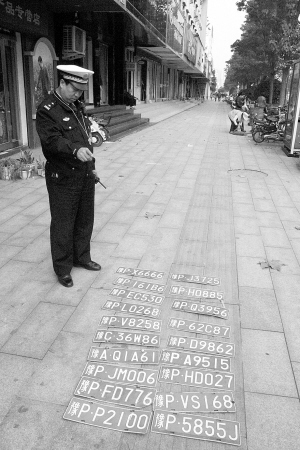 昨日上午,记者来到六一路与七一路交叉口的交警值勤点,看到地上摆了19张车牌(如图)。七一路交巡警大队副大队长赵辉说:“这些车牌都是环卫工人和热心市民在路上捡到后交给了我们。”