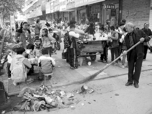记者注意到,占道经营的不仅有校门口两侧门面房摆放的摊位,还有多个用三轮车改装的流动摊点。这些流动摊点大多经营油炸食品、面食、豆腐串等。在流动摊点前,顾客络绎不绝,且大部分是背着书包的孩子。这些流动摊点经营的食品是否安全,令人生疑。学生家长吴先生说:“学校门口的流动摊点,一锅汤能煮很多碗面,并且一锅油一直用来用去。如果孩子吃坏了肚子,找谁追责呢?”吴先生认为,对于学校门前的食品安全问题,要么建立健全监督管理机制,让孩子吃得放心;要么取缔这些流动摊点,防患于未然。