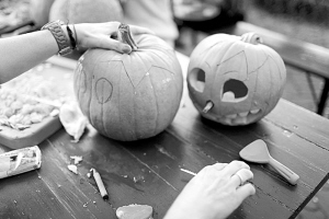 10月21日,在德国首都柏林南部的一座小镇,一名游客在南瓜集市上制作南瓜灯。