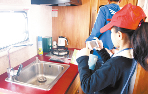 在一家房车展位现场,几辆时尚、豪华、别致的房车吸引了小记者们的眼球。他们登上房车,看到车内还有沙发、厨房用具和床铺等装配,一时难以相信还有这样的房车,个个兴奋得手足舞蹈,现场拍照的声音“咔咔”响个不停。有的小记者为了记录这个美好的场景,还特意让别的小记者为自己拍照留念。