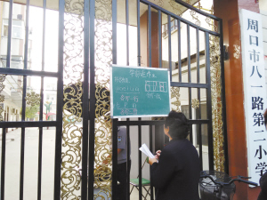 10月24日下午,周五,学生放学前,在周口市区一所小学门前,一位老人正拿着笔和本子,仔细记录小黑板上的学前班作业。