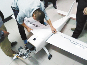 昨日下午,记者来到市规划建筑勘测设计院。房间里,工作人员正在组装“无人机”(如图)。“无人机”并不重,可能是还没有装上机翼的缘故,一名工作人员用双臂抱起“无人机”的机身,在房间内轻松转了个圈。“‘无人机’全部用复合材料制成,虽然体积很大,可并不是很重,再加上里面的仪器还没有全部装进去,所以一个人能比较轻松地抱起机身。”工作人员介绍。