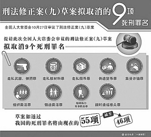 全国人大常委会10月27日审议了刑法修正案(九)草案,拟进一步减少适用集资诈骗罪、组织卖淫罪、强迫卖淫罪等9项死刑罪名,草案如通过,我国的死刑罪名将由现在的55项减至46项。