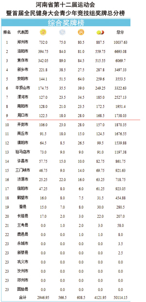 在刚刚结束的河南省第十二届运动会暨首届全民健身大会上,周口给了河南太多的惊喜:和省十一运会由273人组成的周口代表队相比,省十二运会上的周口选手阵容几乎增加了一倍,达到469人;和省十一运会奖牌排名相比,周口从第十五位连升六级,稳坐省十二运会奖牌榜第九把交椅;和省十一运会周口代表队获得50.5枚金牌相比,省十二运会上,周口健儿斩获金牌122.5枚,翻了一番还要多;更让其他省辖市艳羡、周口人骄傲的是:在省十二运会的闭幕式上,周口市市长刘继标接过省运会会旗,正式宣告河南省第十三届运动会花落周口,千万人口大市首次拥有了省运会的承办权!此刻起,河南体育的焦点也迅速向我们周口转移、凝聚!