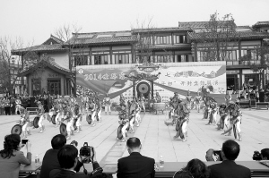 本报讯 近日,在开封市珠玑巷守望阁广场举办的世界客属第27届恳亲大会暨中国开封第32届菊花文化节“喜迎天下游子归”开封盘鼓展演中,我市国家级非遗项目——项城官会响锣参加了此次表演活动(如图)。