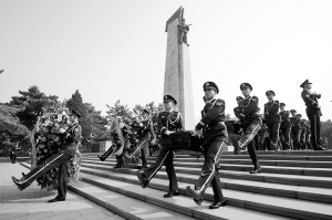 10月29日,礼兵护送志愿军烈士遗骸棺椁进行安葬。