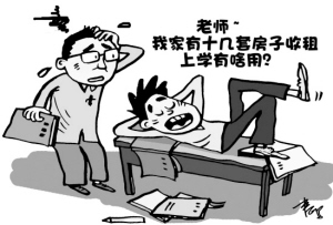 近日数十名家长自发“组团”到北京市中小学心理咨询中心寻求专家的帮助。初中男生小虎的妈妈来求助是因为老师实在管不了孩子,他老是闹着辍学。小虎家有14套房,自住2套,另12套房都租出去了。“我家租房收多少钱我都心里有数,那些钱够我吃三辈子了,为什么还要上学?我只要会收房租就行了。”小虎对咨询师说。