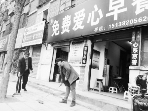 本报讯 10月30日上午,在周口市区建设大道上的一家早餐店内,焦阳光和刘明一边擦桌子、扫地,一边准备第二天早晨用的蔬菜和面粉。因为,他们在周口市区开设的第一家免费爱心早餐店第二天就要正式向环卫工人开放了!