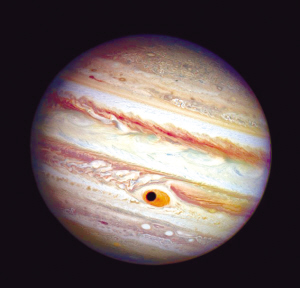 哈勃望远镜的这幅照片是在2014年4月21日拍摄的,当时这架望远镜正在观测木星大红斑风暴的变化。曝光过程中,木卫三“盖尼米德”的阴影划过大红斑的中央。这一次的相遇让木星长出一只直径1万英里(约合1.6万公里)的巨眼。宇航局表示:“那一刻,木星像独眼巨人一样盯着哈勃望远镜。”木星上会爆发很多异乎寻常的风暴,大红斑只是其中之一。(新网)