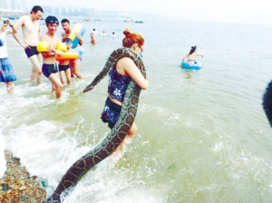 1.在大连开发区南坨子浴场,一名女子带着一条巨大的蟒蛇到海里冲凉,立刻引来了很多人围观,据蟒蛇的主人说,这条蟒蛇已经跟了她11年了。