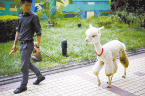 4.西安,朱先生和萌宠羊驼在玩耍。朱先生花费近十万元人民币买下来自秘鲁的纯种羊驼,这只羊驼叫君君,已有11个月大。