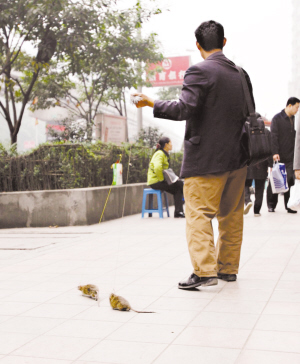 2.重庆市九龙坡区杨家坪步行街,一名牵着两只老鼠“逛街”的男子吸引得好奇的路人纷纷驻足观看。