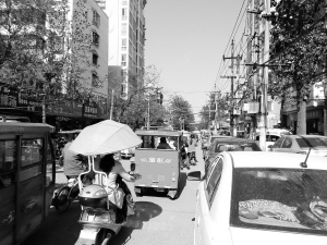 记者注意到,由于机动车随意停放在非机动车道和人行道上,加之道路两侧的人行道让商家霸占了,使道路变得狭窄拥挤。在这条路上,不管是开车的还是行人,都得小心翼翼,稍不留神就会出现交通意外。