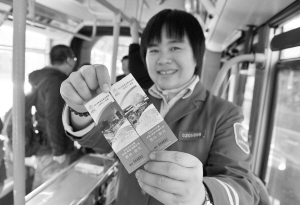 11月3日,一名公交售票员展示“APEC会议”公交纪念车票。