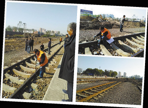 本报讯 备受市民关注的八一大道大修及延伸工程又有新的进展。11月4日上午,记者在周口老火车站看到,几名铁路工人正在拆除站台原有铁轨(如图)。老火站站台铁轨全部拆除完毕后,八一大道的贯通指日可待。