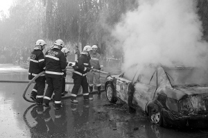 昨日上午,记者来到事发地点,看到一辆轿车已经被烧得“面目全非”,消防官兵正喷水灭火(如图)。据了解,轿车自燃后,车主拨打了119报警。