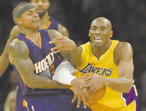 11月4日,湖人队球员科比·布莱恩特(右)与太阳队球员伊赛亚·托马斯在比赛中拼抢。