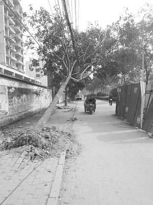 11月9日,记者在周口市区五一路与黄河路交叉口东侧,看到一棵倾斜的树树根裸露在外,被几根电线“撑”住,没有倒在地上。附近居民李先生告诉记者:“这棵树已经倾斜好几天了,一直也没人管。每次看到有人从树下经过,我就担心支撑这棵树的电线会突然被压断,砸到行人。希望有关部门快来管一管。 ”晚报记者 宋风 摄