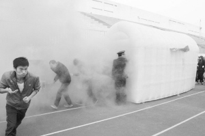 11月7日上午,周口师范学院的大学生们上了一堂生动的“消防课”。当日,周口市消防支队的消防官兵来到该校为大学生们讲解宿舍防火常识以及如果应对火灾隐患等。图为大学模拟火场逃生。晚报记者 朱东一 摄
