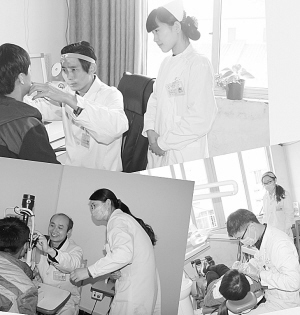 眼科由赵文超、张增春两位主治医师和吴慧执业医师坐诊,配有眼科AB超、高倍显微镜等精尖设备。眼科的患者也以学生和老年人为主。针对老年人,主要是免费的白内障复明工程和青光眼治疗;对于学生,主要是眼科保健和常规视力治疗。采访当日,在眼科,记者亲眼目睹了一个令人揪心的小手术——眼球里挑刺。用高倍显微镜观察到一位患者眼球上扎了一根玻璃丝后,张增春首先往患者的眼球上点滴麻药水,然后用针头把玻璃丝挑了出来,最后他给患者的眼球点了修复药水,手术完成。此外,眼科还能做角膜穿孔缝合、换置眼胎(假眼)。
