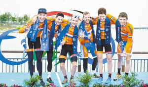 11月9日,荷兰队队员在颁奖仪式上庆祝。荷兰队以71小时02分53的成绩获得团体成绩第一。