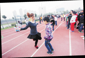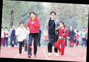15时许,在小记者和家长的期许中,第一个绑腿跑亲子互动游戏拉开序幕。按照游戏规则,家长必须先背着自己的孩子原地转3圈,再用绳子把两个人的各自一条腿绑在一起,等待裁判员的哨声。