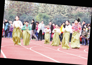 绑腿跑、袋鼠跳、运气球、滚铁环……