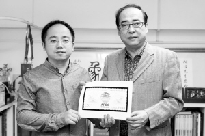 亚太经合组织第二十二次领导人非正式会议纪念邮票的设计者何洁(右)、周岳手持票样合影(摄于11月4日)。
